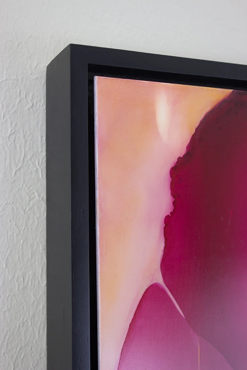 "Grace" installed in the Ampersand Floater Frame (corner detail), ink and acrylic on Claybord, 20"x16"x1/8", 2017.